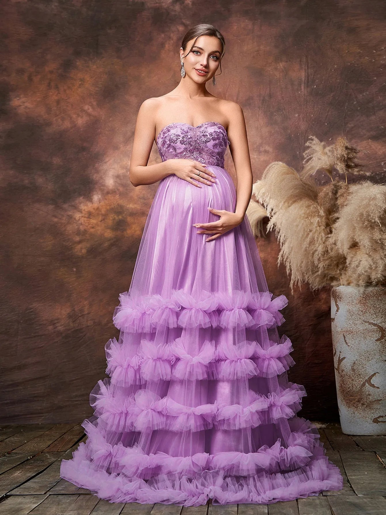 Step into elegance with this breathtaking maternity gown, designed to make you feel both radiant and regal. The gown features a beautifully embellished sequin bodice with a strapless sweetheart neckline, offering a touch of glamour and sophistication. The lace-up back ensures a perfect fit, accentuating your silhouette while providing comfort. The standout feature of this gown is the cascading layers of ruffled tulle, adding volume and a whimsical touch to the flowing skirt. The soft hue enhances its romantic appeal, making it an ideal choice for those special moments.