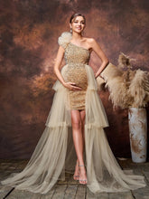 Maternity One Shoulder Tulle Overlay Sequin Party Dress - Champagne