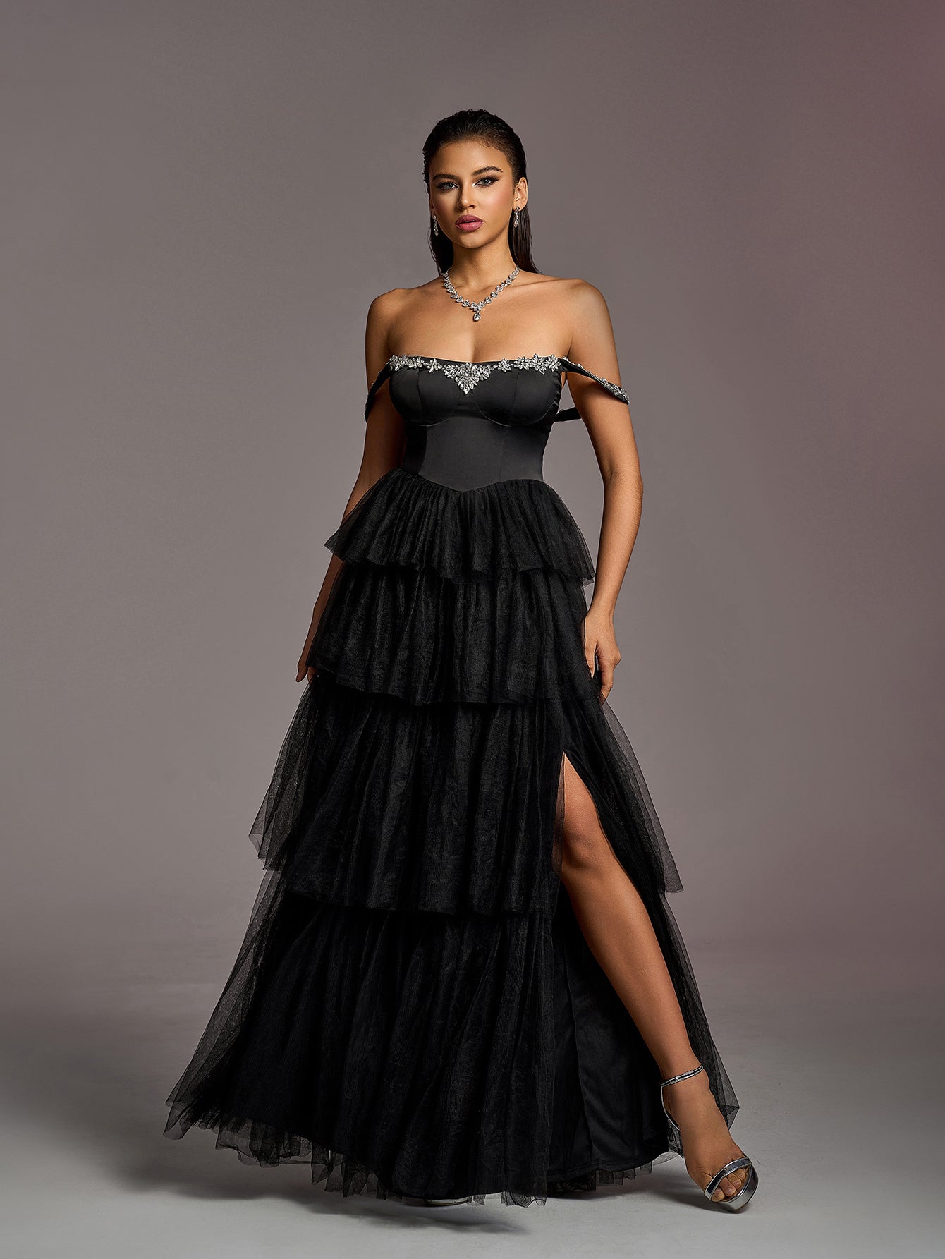 Elevate your evening look with our stunning tulle gown, perfect for any formal occasion. The gown features an off-shoulder neckline adorned with intricate embellishments, adding a touch of sophistication. The fitted bodice pairs seamlessly with the tiered tulle skirt, creating a dramatic and flowing silhouette. The high slit adds a seductive element, allowing you to showcase your confidence and grace.
