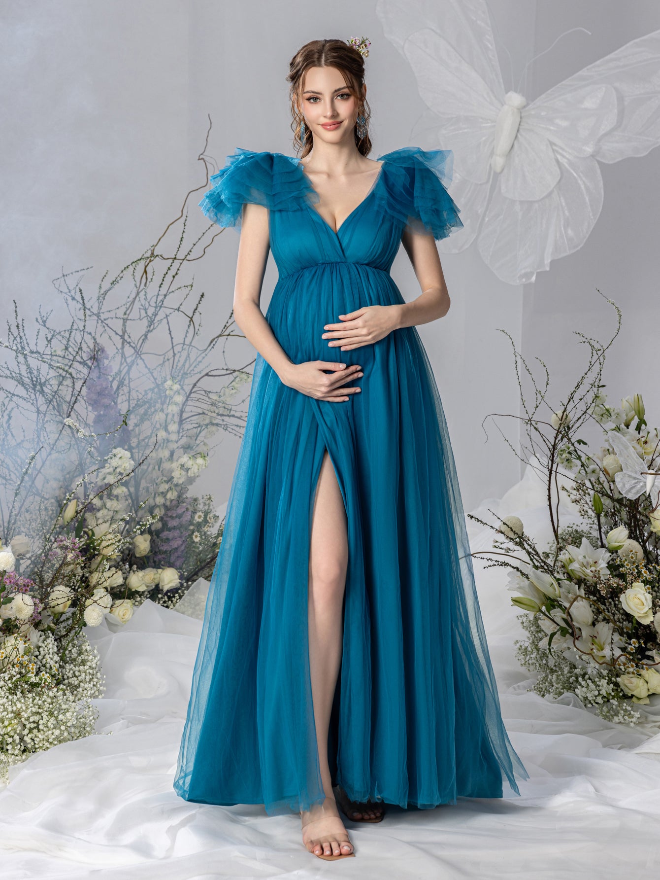Maternity Plunging Neck Ruffle Sleeve Mesh Slit Dress - Elonnashop