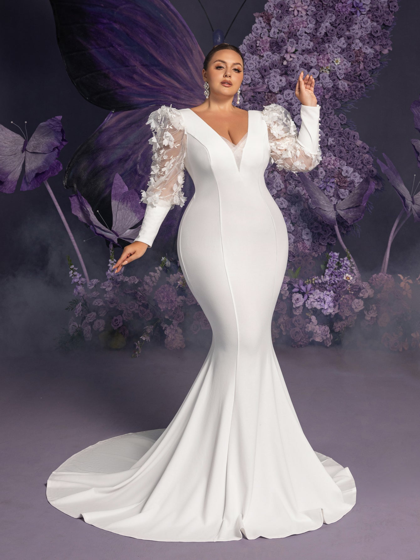 Elegant and sophisticated, this wedding gown is a masterpiece of design and craftsmanship. The gown features a deep V-neckline that accentuates the neckline while offering a touch of allure. The sleeves are adorned with intricate floral appliqués, adding a delicate and romantic touch to the overall design. The fitted silhouette of the gown flares out into a stunning mermaid train, creating a dramatic and graceful effect.