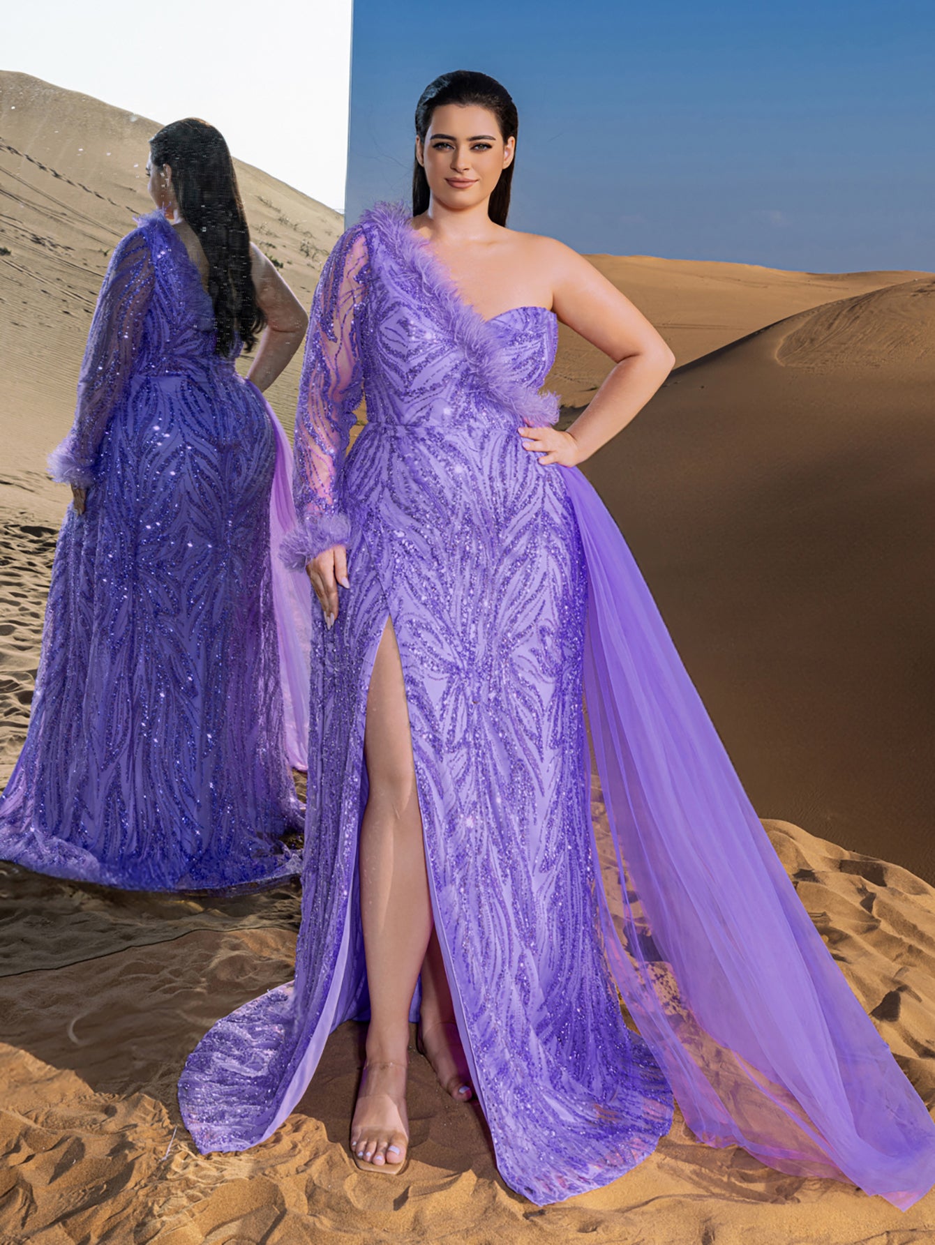 Elevate your style with our stunning beaded sequin evening gown, perfect for making a statement at any formal event. The gown features a one-shoulder neckline and a fitted bodice that accentuates your curves, leading to a dramatic high slit that adds a touch of allure. The intricate sequined fabric creates a luxurious and glamorous look, while the feathered details on the sleeves add a whimsical touch.