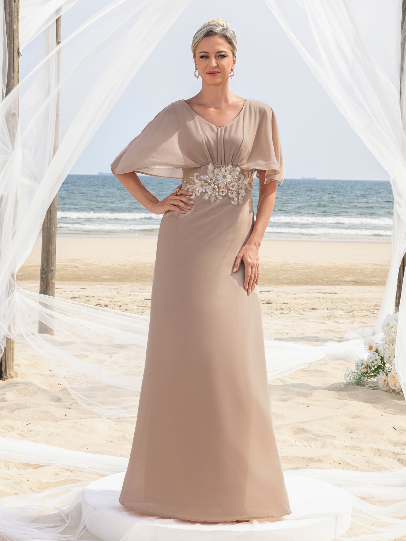 Formales Damenkleid aus Chiffon mit Applikationsdetail und V-Ausschnitt