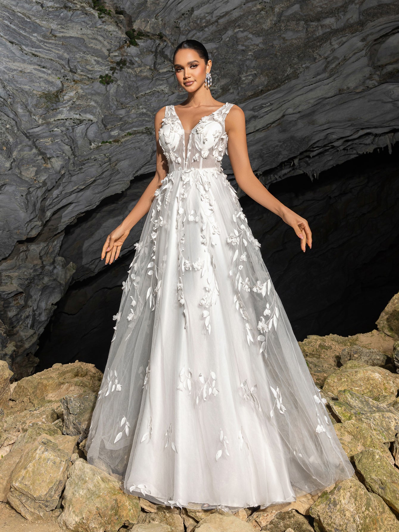 Gorgeous Floral Applique Plunging Neck Backless A-line Wedding Dress