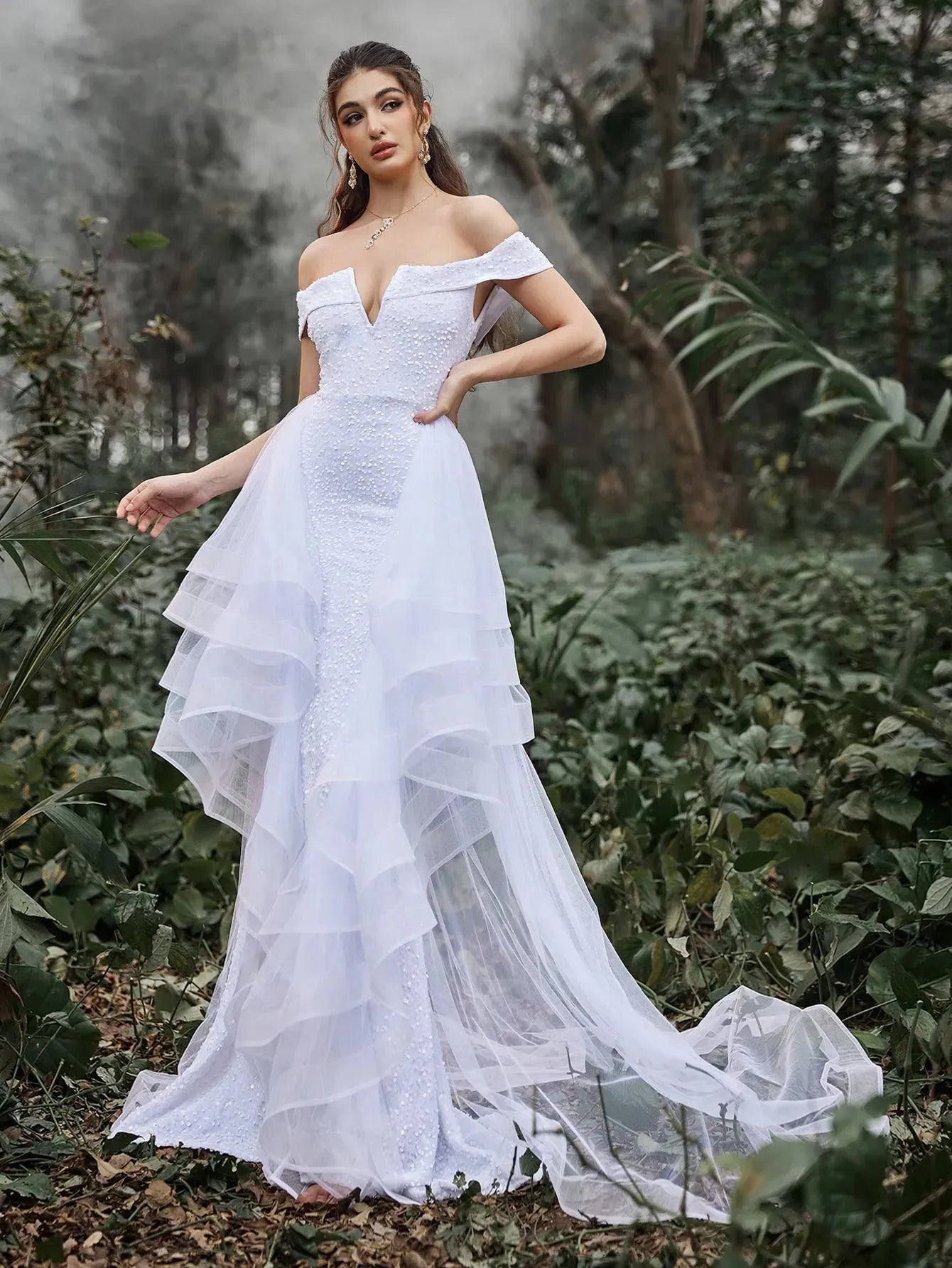 Step into elegance with this captivating off-the-shoulder gown, perfect for making a statement at any formal event. The dress features a beautifully structured V-neckline that gracefully frames the shoulders, accentuating the neckline. The bodice is adorned with intricate sequins, adding a touch of sparkle that catches the light with every movement. The figure-hugging silhouette flows into a tiered, ruffled skirt that adds dramatic flair, cascading down into a subtle train for a truly regal look.
