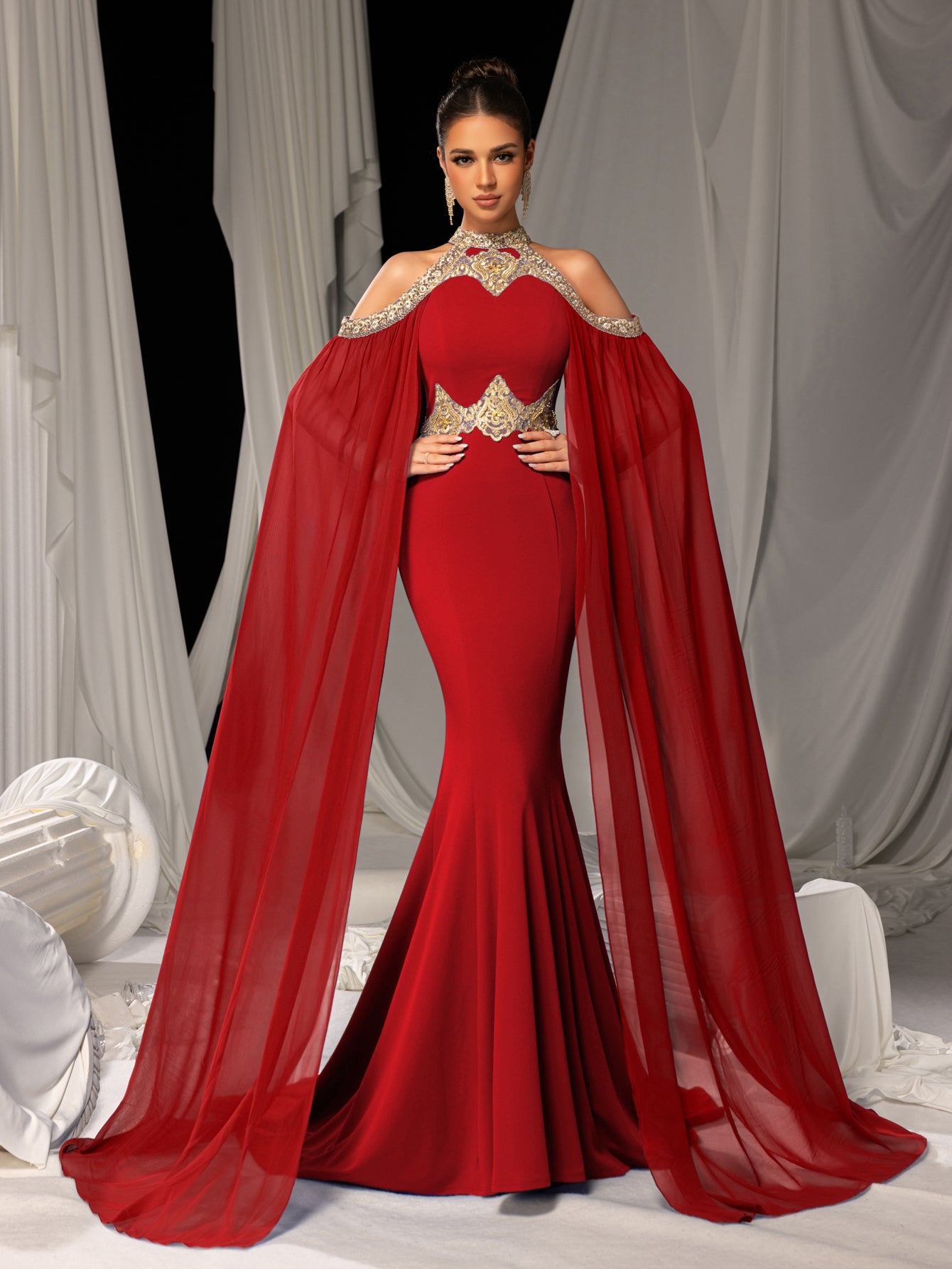 ✨ Opulent Elegance: The  Mermaid Gown showcases a form-fitting silhouette that accentuates every curve, paired with a dramatic flowing cape for added grandeur. Intricate gold embellishments around the neckline highlight timeless luxury, while the white drape backdrop creates a striking contrast to amplify its visual impact.