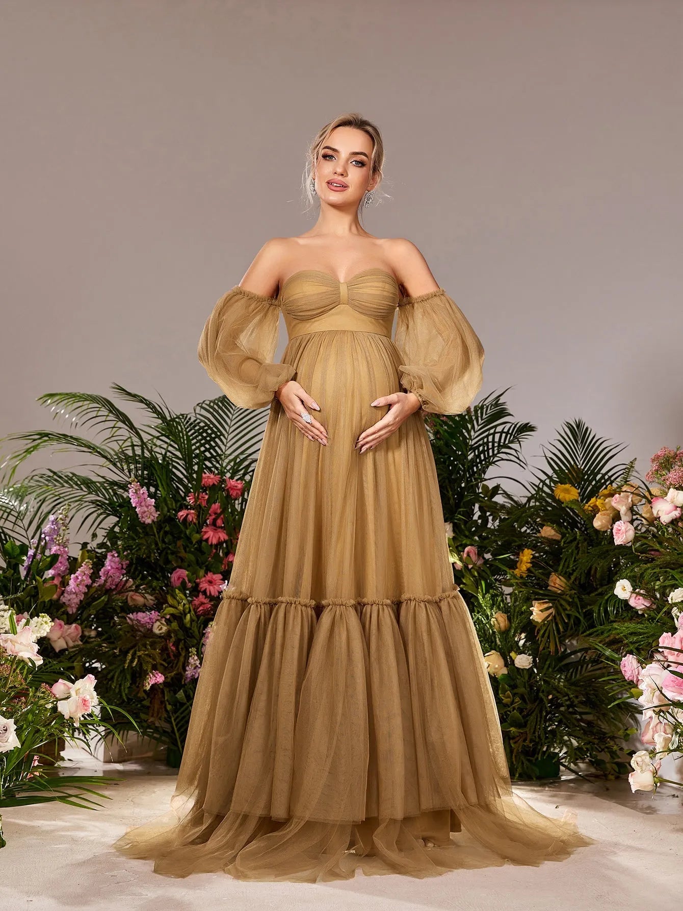 Embrace your pregnancy glow in this tulle maternity gown. Featuring a strapless bodice with a sweetheart neckline, this gown is designed to highlight your natural beauty. The voluminous, puffy long sleeves add a dramatic flair, while the flowing skirt falls gracefully to the floor, creating a stunning silhouette. The empire waist ensures comfort without compromising style.