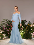 Make a breathtaking entrance with our exquisite maternity gown, designed to celebrate your beauty during this special time. This gown features an off-the-shoulder neckline with long sleeves, offering a blend of elegance and modernity. The figure-hugging bodice transitions into a stunning mermaid silhouette, flaring into a tulle-adorned skirt that adds a touch of ethereal charm.