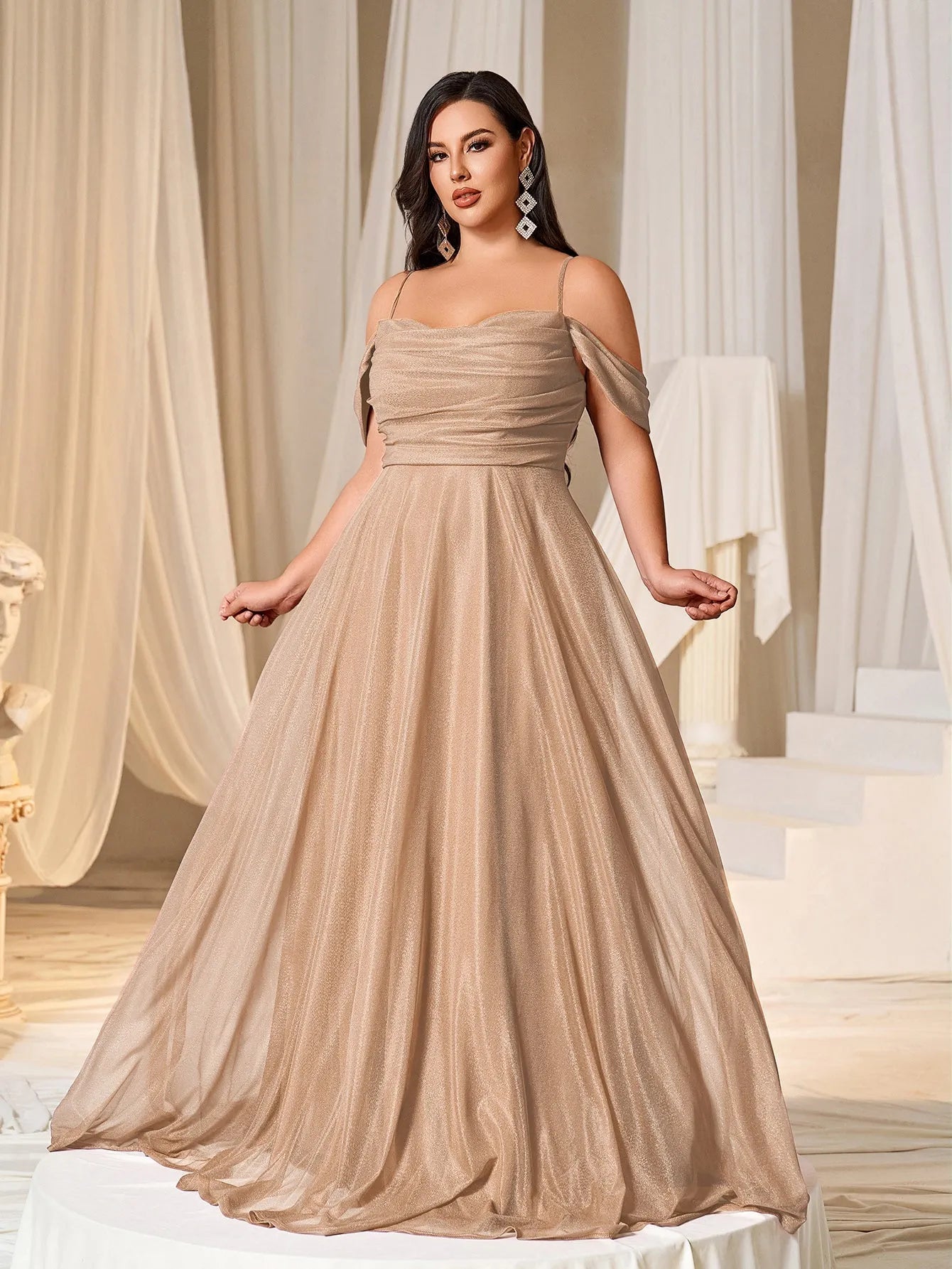 Radiate elegance with this stunning gown, designed for a romantic and ethereal look. The dress features delicate off-shoulder draped sleeves and thin spaghetti straps, creating a flattering and feminine silhouette. The lace-up back adds a touch of allure, while the flowy A-line skirt glides effortlessly with every step.