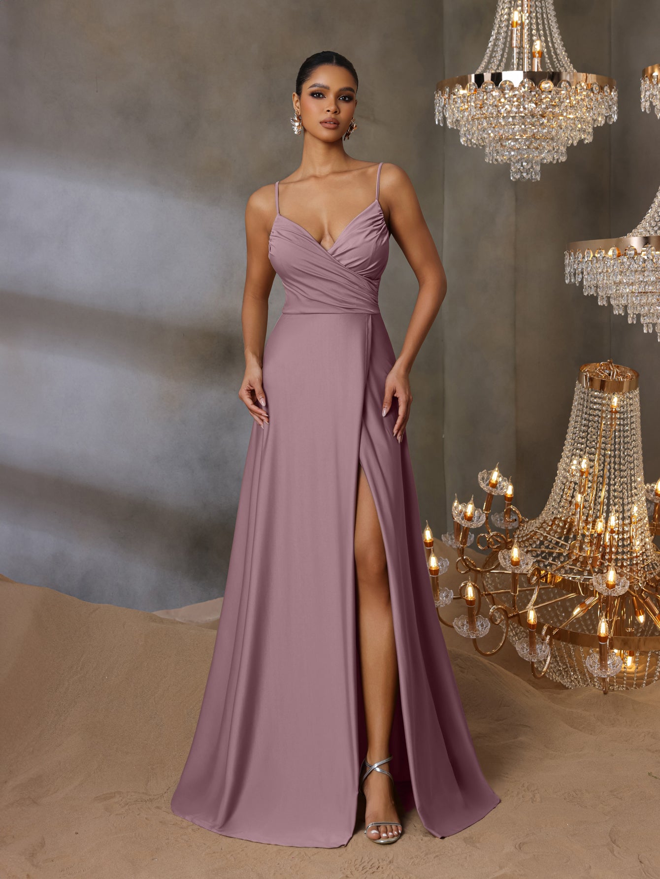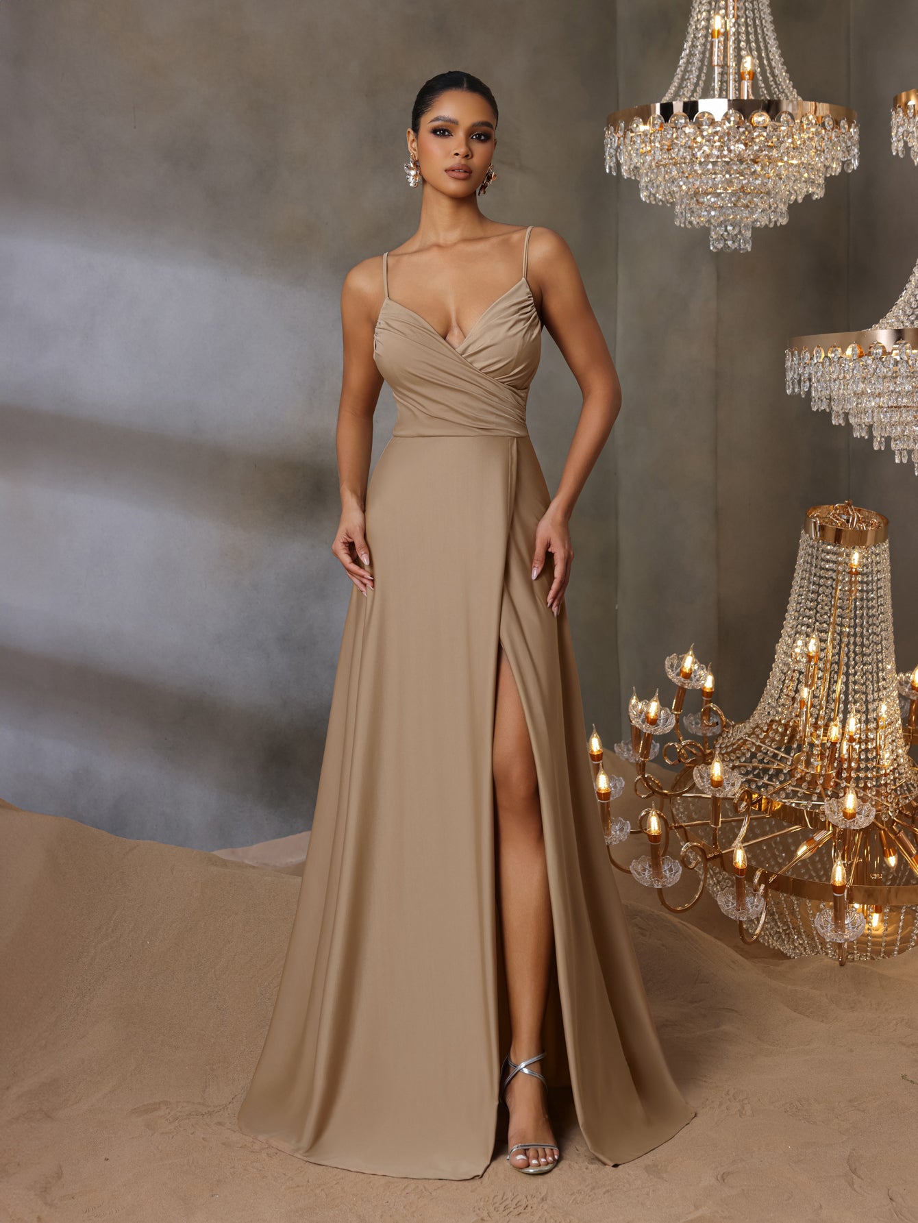 Channel effortless elegance in this seafoam gown, a true testament to understated luxury. Its delicate spaghetti straps and artfully ruched bodice offer a contemporary twist to the classic silhouette, culminating in a sultry thigh-high slit that adds just the right touch of allure. Perfect for sophisticated evenings, this dress is a seamless blend of timeless style and modern sensuality, sure to captivate at any soiree or promenade.