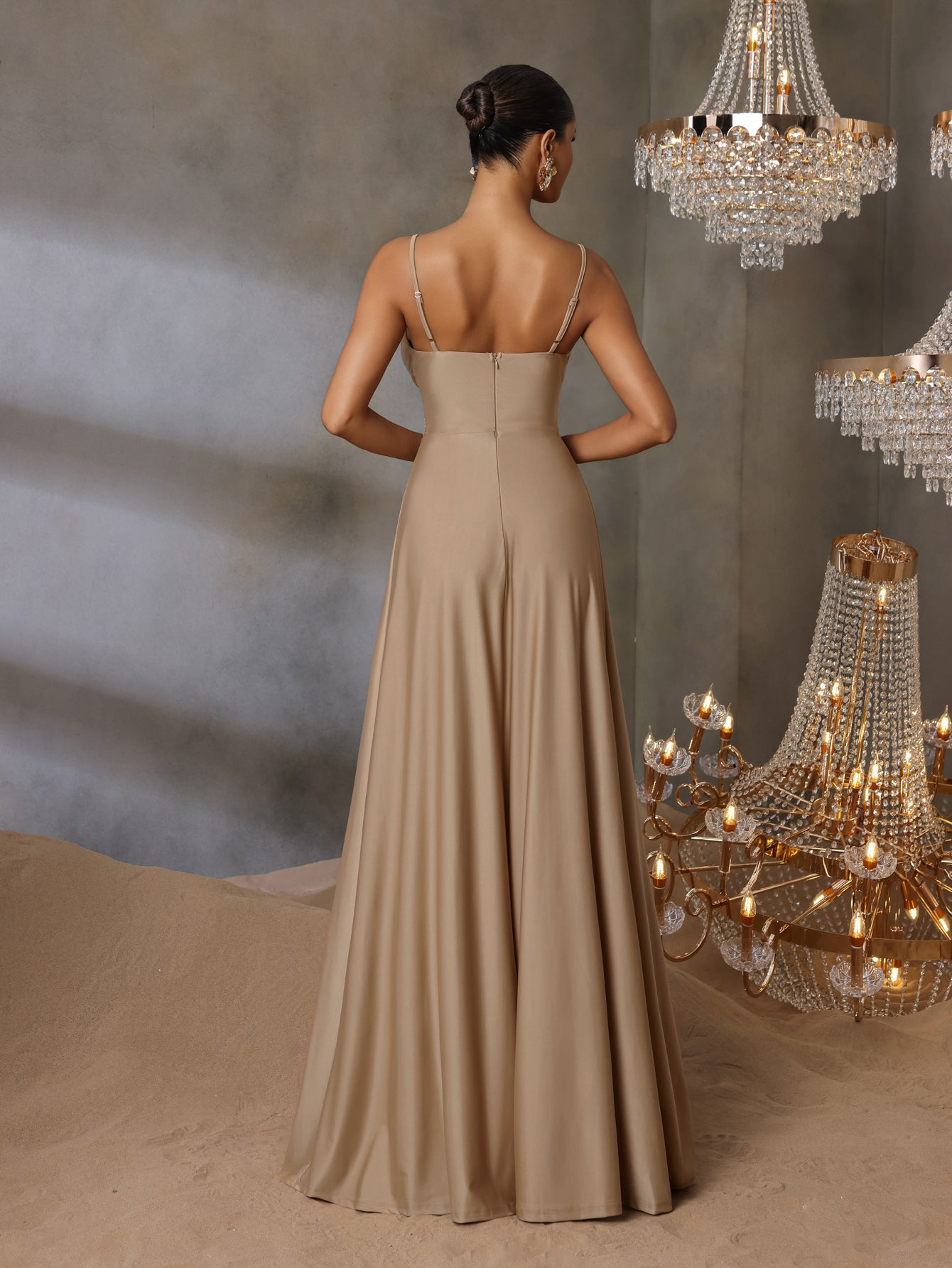 Solid V Neck Split Thigh Cami Bridesmaid Dress - Elonnashop