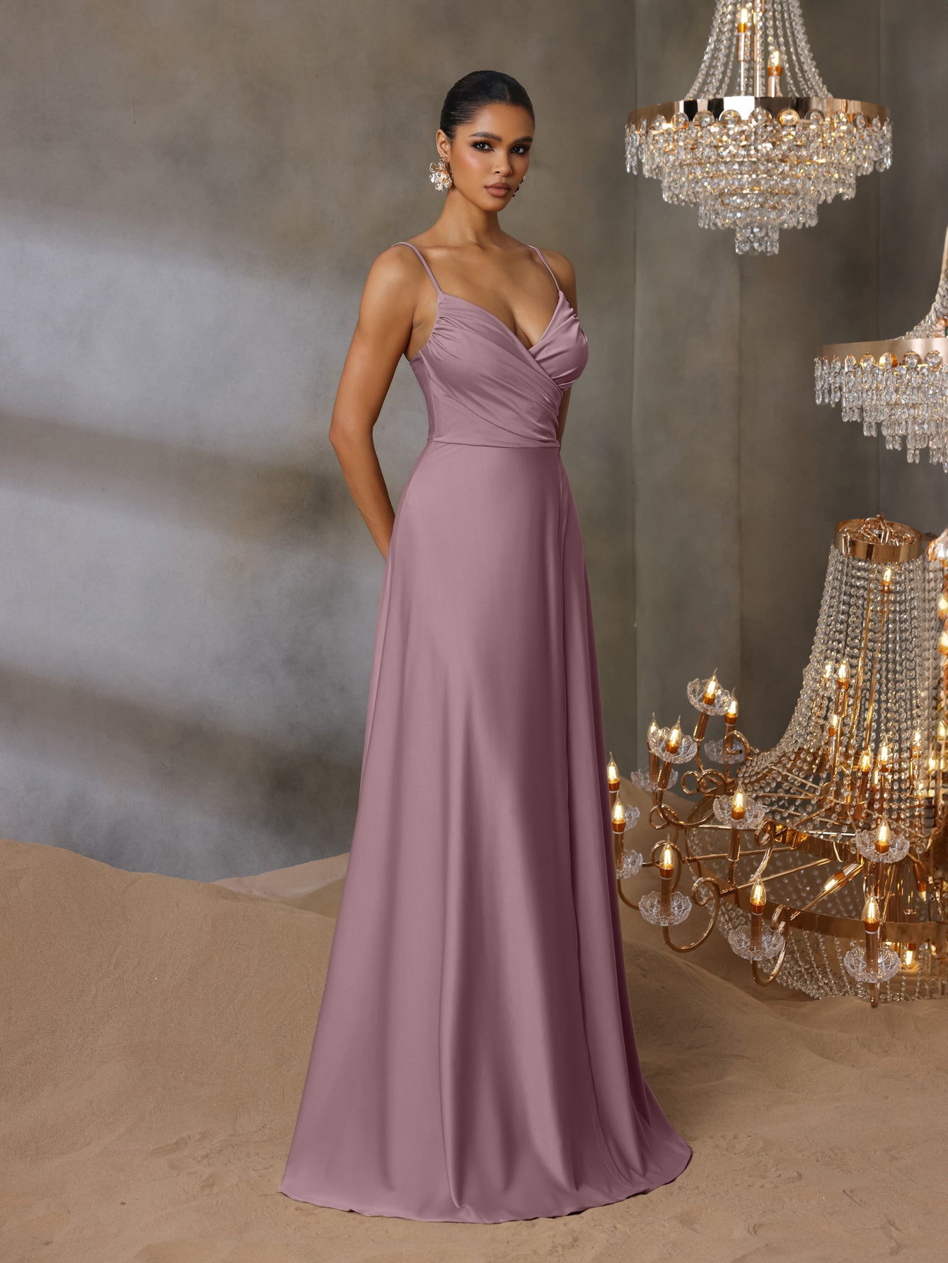 Solid V Neck Split Thigh Cami Bridesmaid Dress