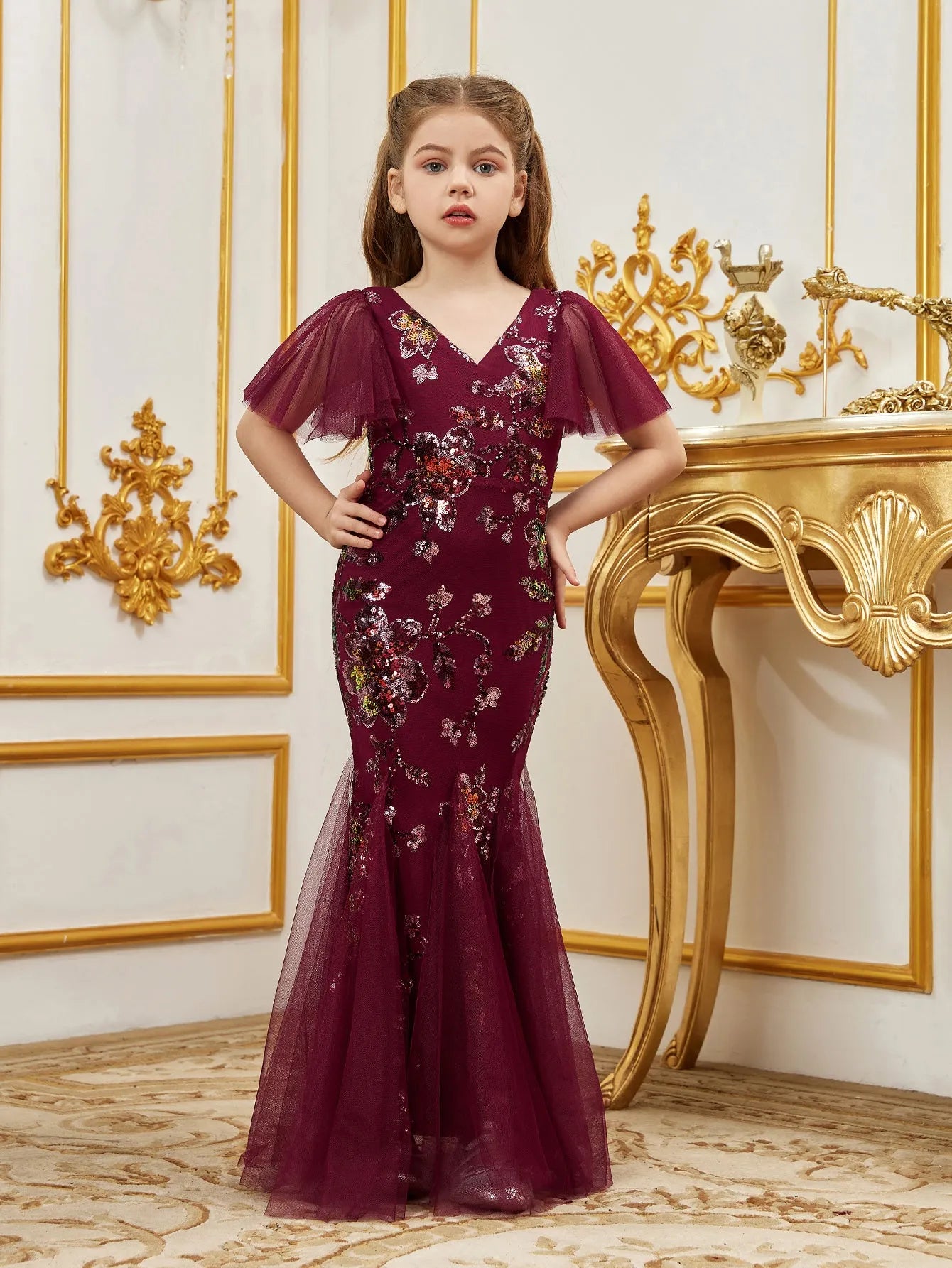 Elevate her style with this enchanting mermaid-style gown in a rich burgundy hue, crafted to make any young girl feel like a star. Intricately adorned with sparkling floral sequin detailing, this dress catches the light beautifully, adding a touch of glamour to any occasion. The V-neck bodice is complemented by delicate, fluttering short sleeves that enhance its fairytale appeal, while the mermaid silhouette gracefully flares into a soft tulle hem, creating a charming and elegant look.