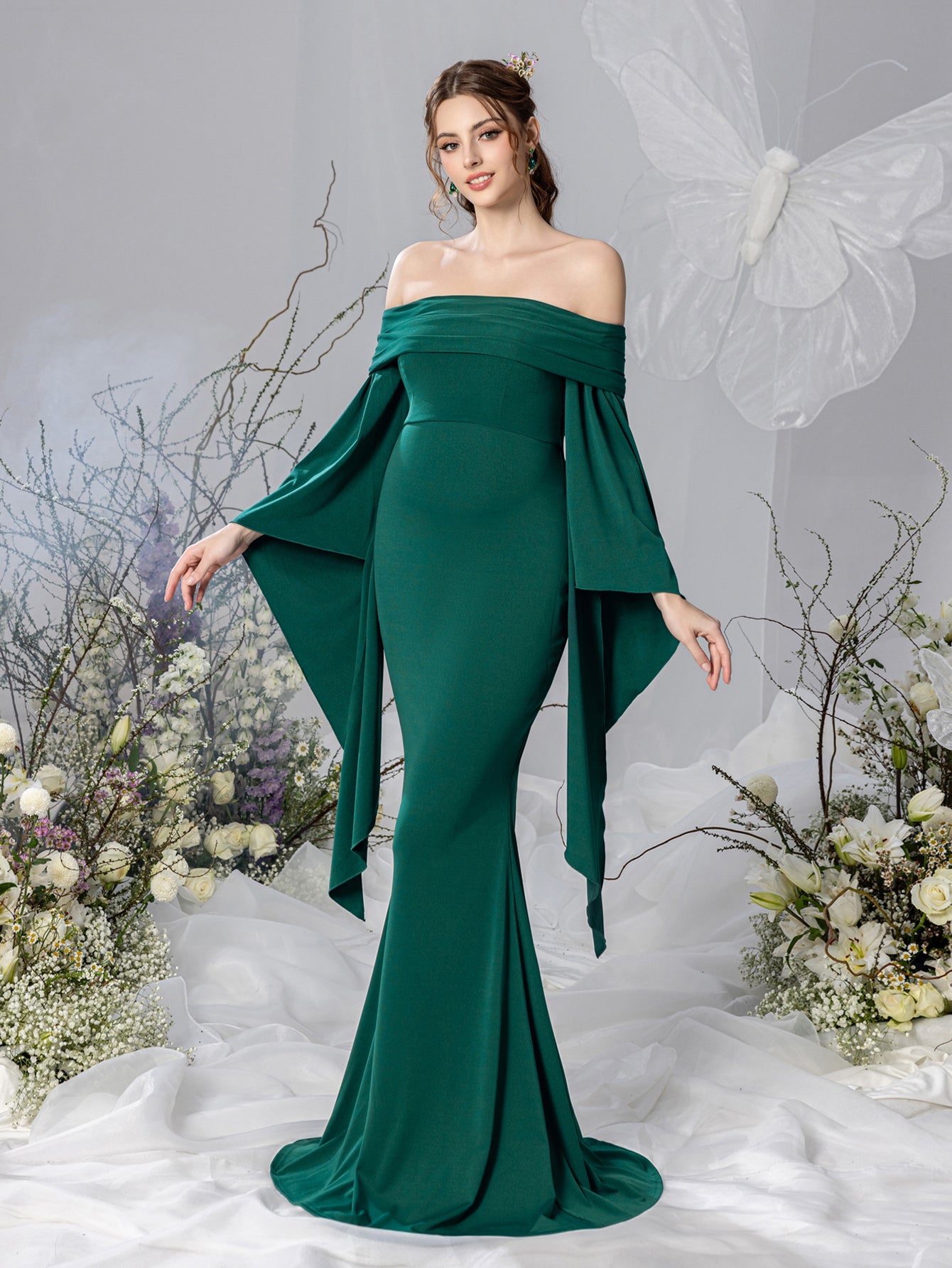 Make a breathtaking entrance with our exquisite maternity gown, designed to celebrate your beauty during this special time. The gown features an elegant off-the-shoulder neckline and a figure-flattering mermaid silhouette that gracefully drapes over your bump, ensuring comfort and sophistication. The rich hue fabric adds a luxurious touch, while the dramatic, flowing sleeves create a statement of timeless elegance.