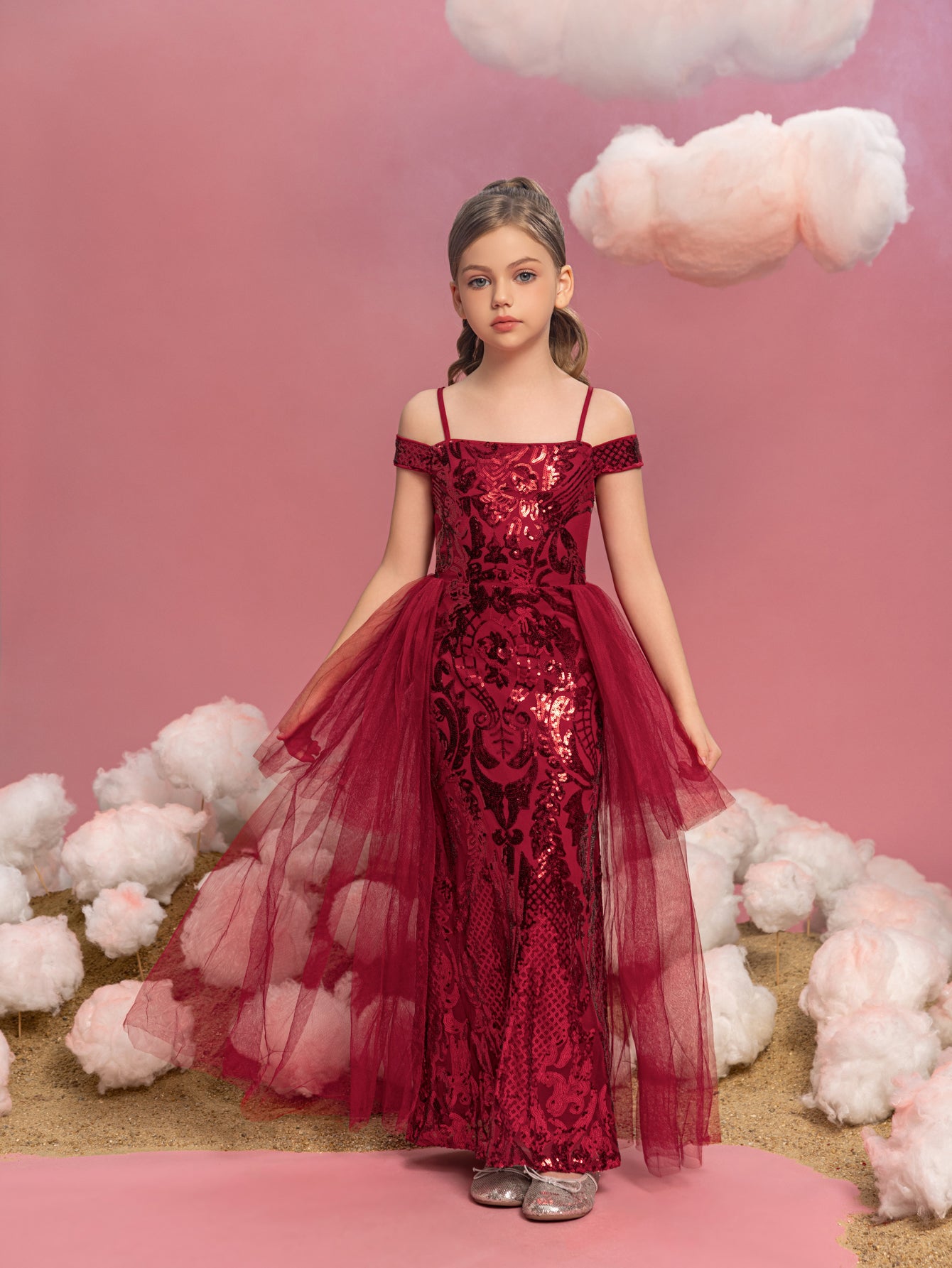 This exquisite evening gown for young girls radiates sophistication and charm, making it perfect for any formal occasion. The dress features a fitted bodice adorned with intricate sequin patterns that catch the light beautifully, creating a captivating sparkle. The off-the-shoulder design, paired with delicate spaghetti straps, adds a touch of modern elegance, while the layered tulle overlay on the skirt enhances the gown's graceful flow. The gown’s tea-length design allows for ease of movement, ensuring comfort throughout the event. The back of the dress mirrors the front with its detailed sequin work and a subtle zipper closure for a secure fit. Crafted from high-quality materials, this gown combines luxury and style, making it ideal for pageants, formal events, or holiday celebrations. With its blend of intricate design and rich color, this dress ensures your young one will stand out with grace and confidence, radiating timeless beauty and elegance.