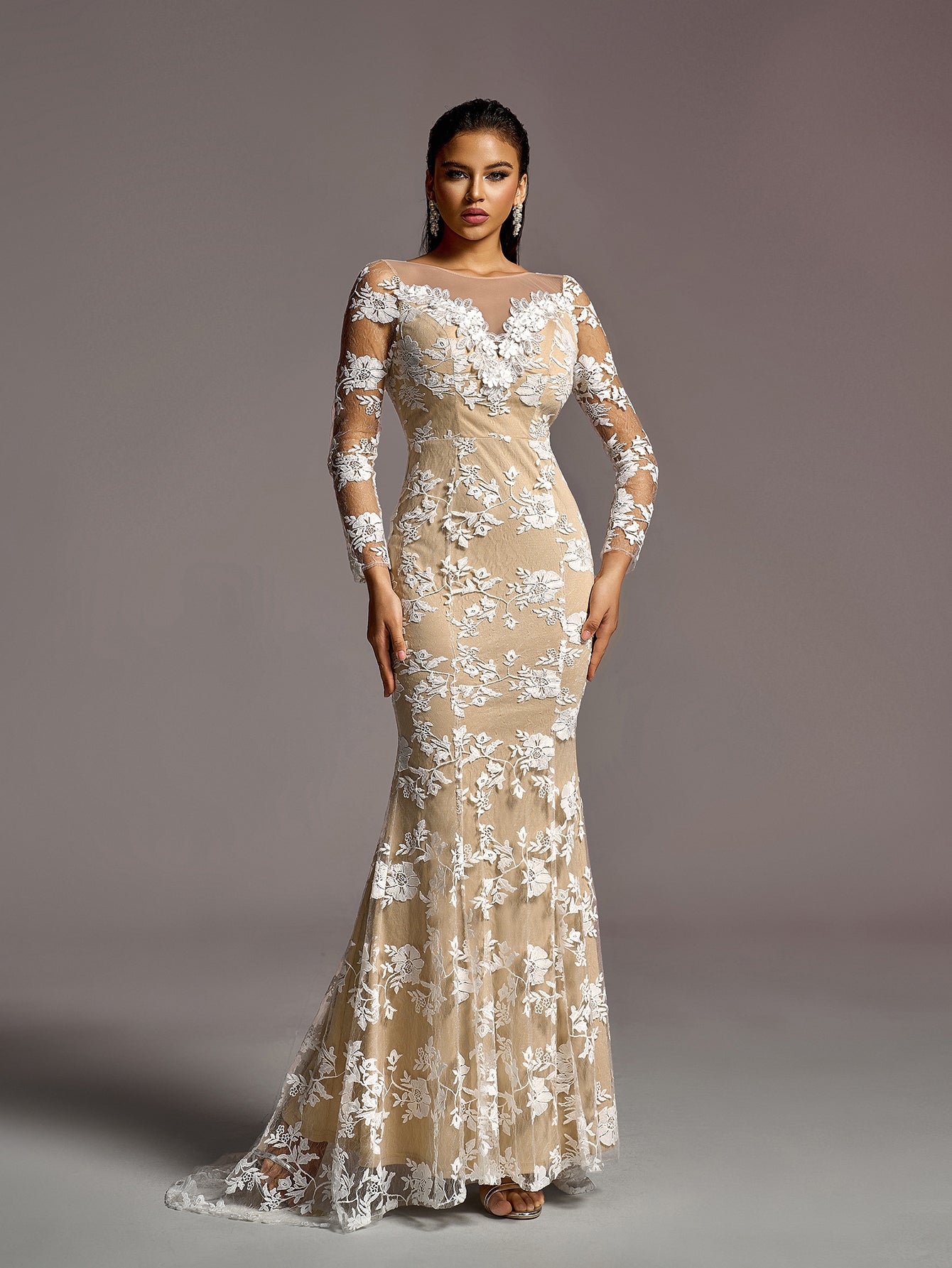 Elegant and sophisticated, this bridal gown is a masterpiece of craftsmanship and design. The gown features a sweetheart neckline that accentuates the neckline while offering a touch of modesty. The long sleeves are adorned with intricate lace appliqués, adding a delicate and romantic touch to the overall look. The form-fitting silhouette flares slightly at the bottom, creating a timeless mermaid style that is both flattering and graceful.