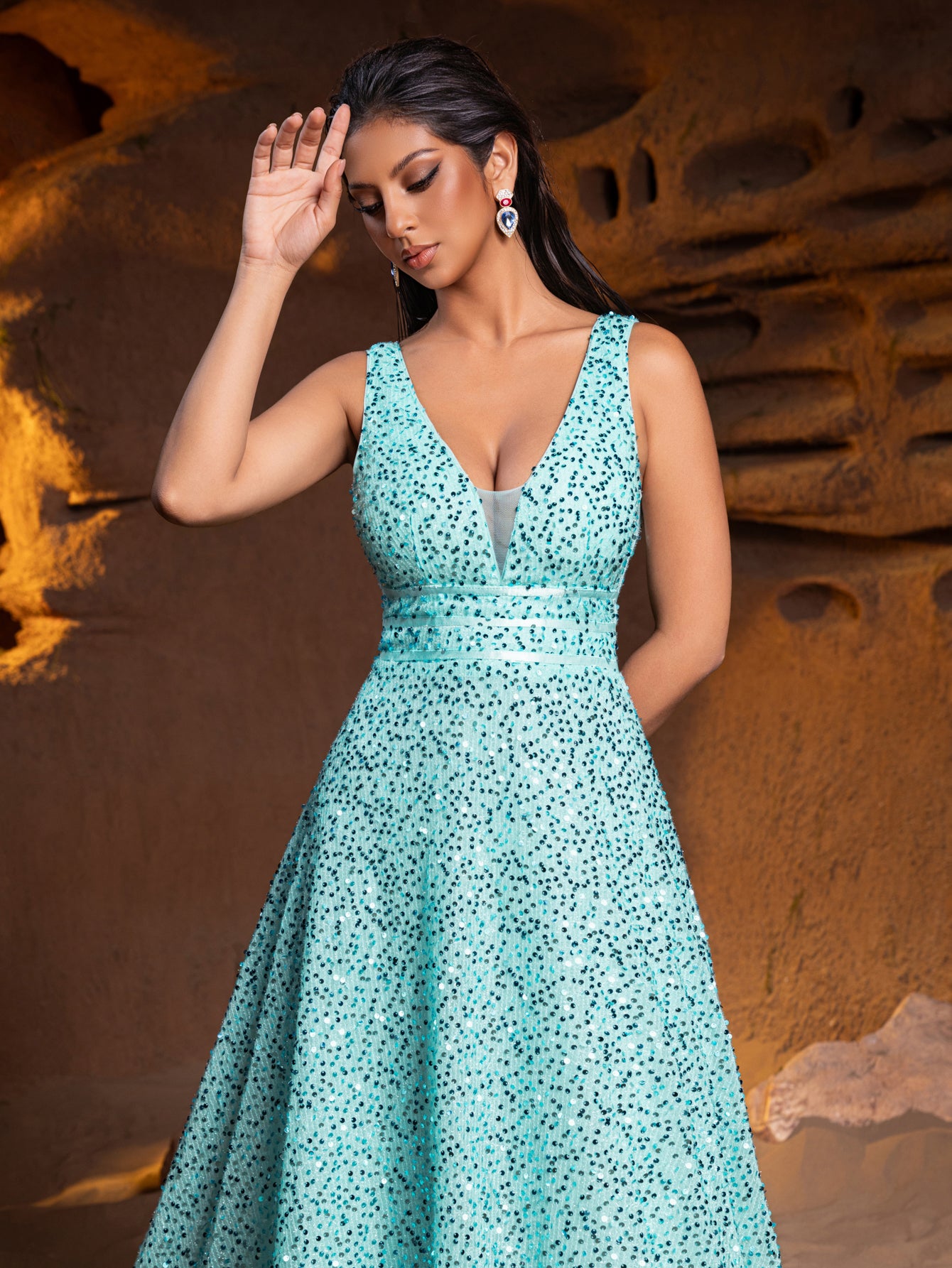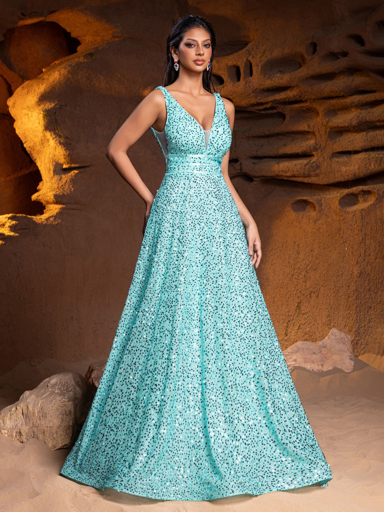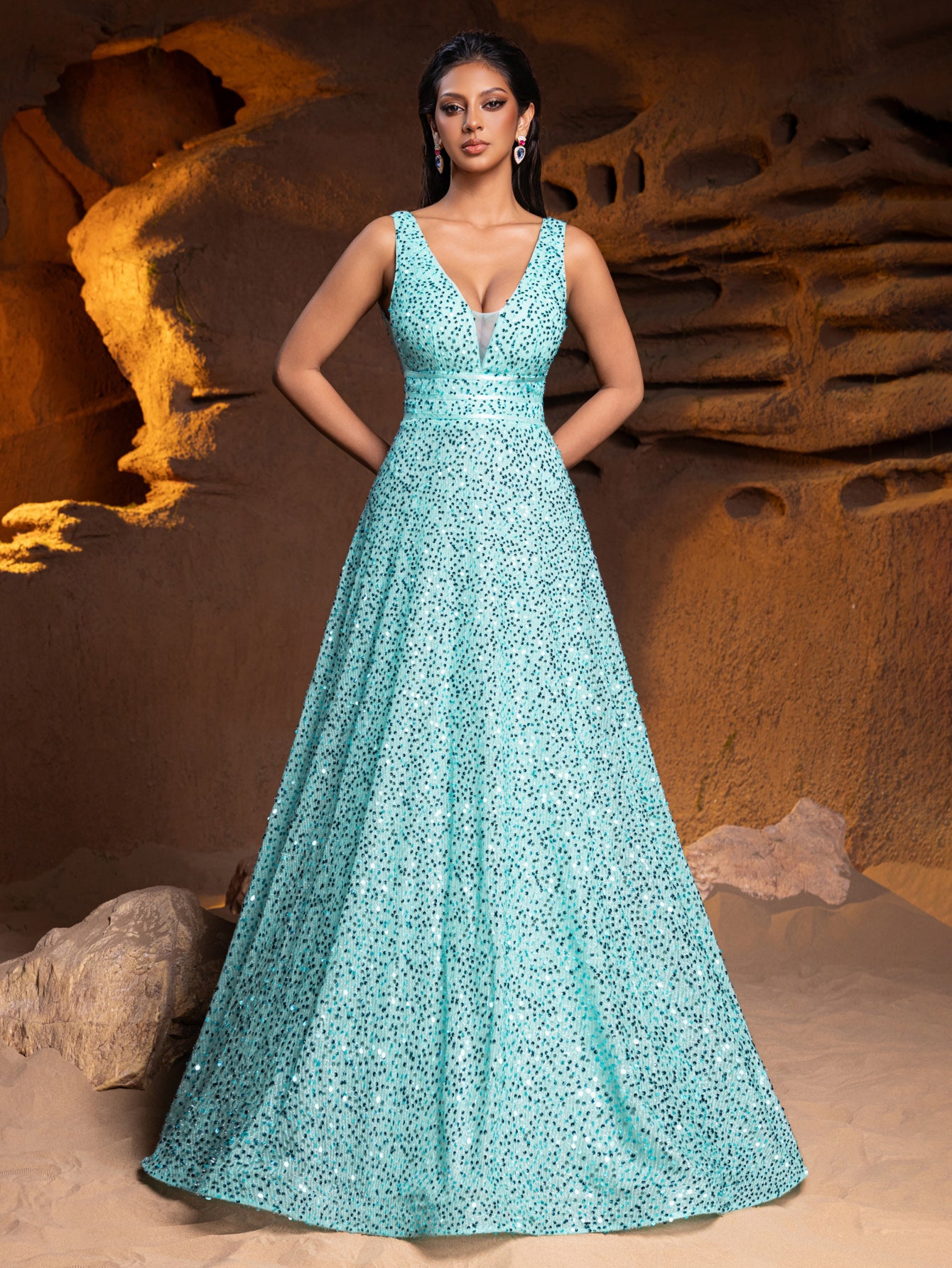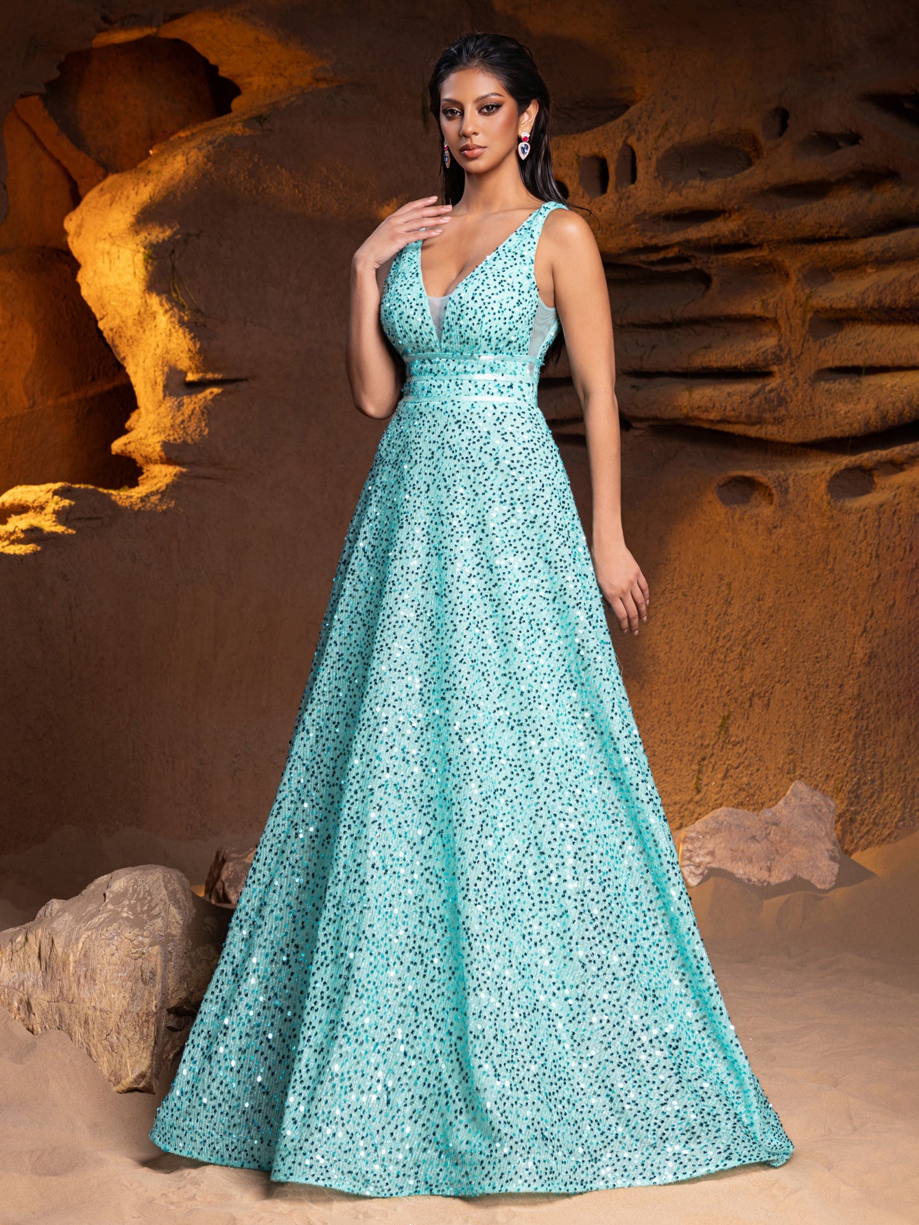 Elevate your evening wear with our classic elegance sequin gown, a piece that embodies sophistication in every stitch. This dress is designed to celebrate your figure, featuring a flattering V-neckline and a sleeveless bodice that invites the addition of statement jewelry to complete the look. The gown is fully embellished with delicate sequins, giving it a luxurious shimmer that catches the light with grace.The silhouette of this gown is universally flattering, with a cinched waistline that flows into a full A-line skirt, promising a smooth glide across any dance floor or through any gala event. The floor-length hem adds a touch of tradition and elegance, making this gown suitable for the most formal of occasions.Turning to reveal a V-back, the design maintains a balance of modesty and allure, ensuring you feel confident and beautifully supported. The gown's construction ensures a comfortable fit that moves with you, allowing for a night of ease and enjoyment.