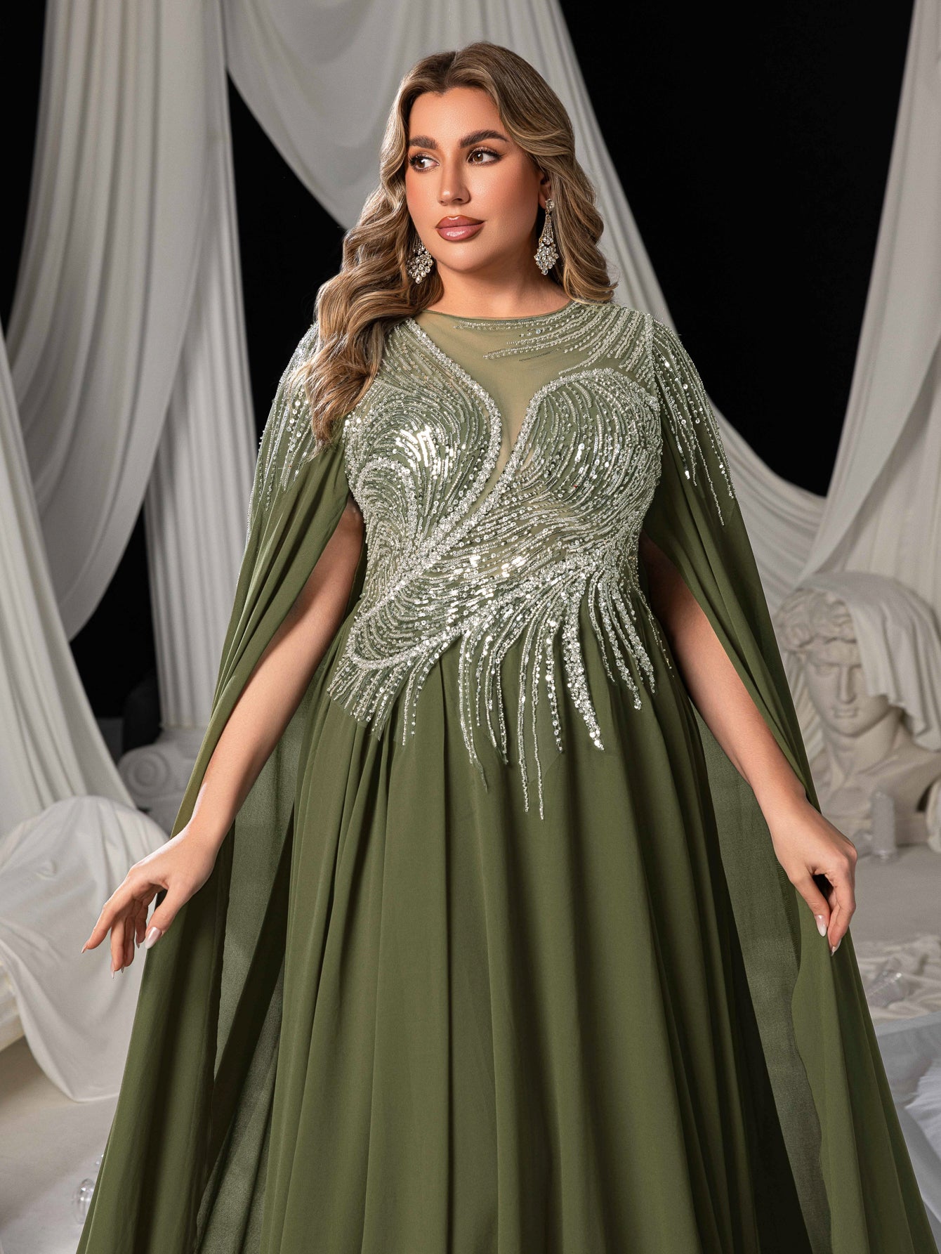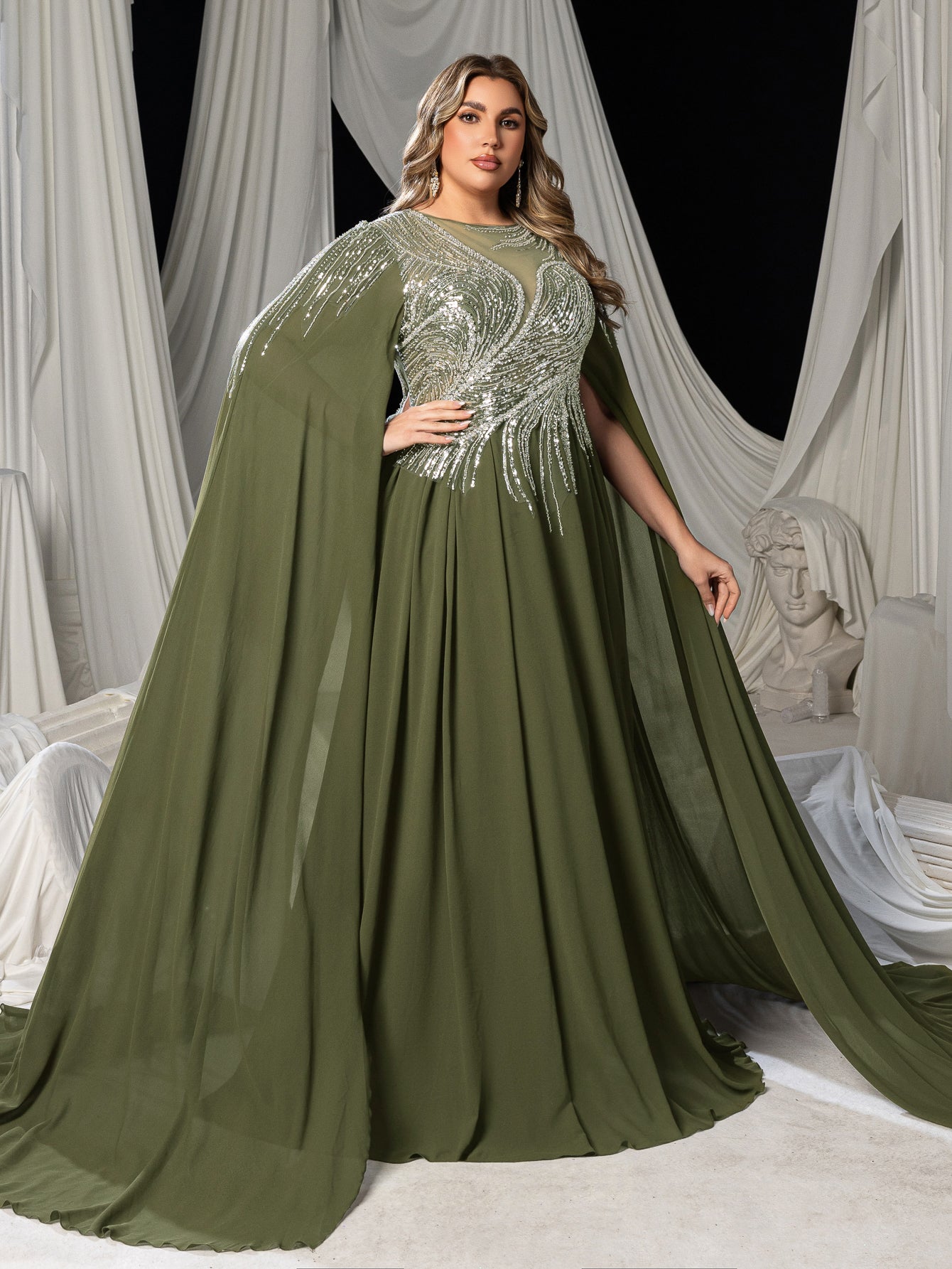 Plus Elegant Cape Sleeve Evening Gown with Beaded Floral Embroidered Bodice & Flowing Train