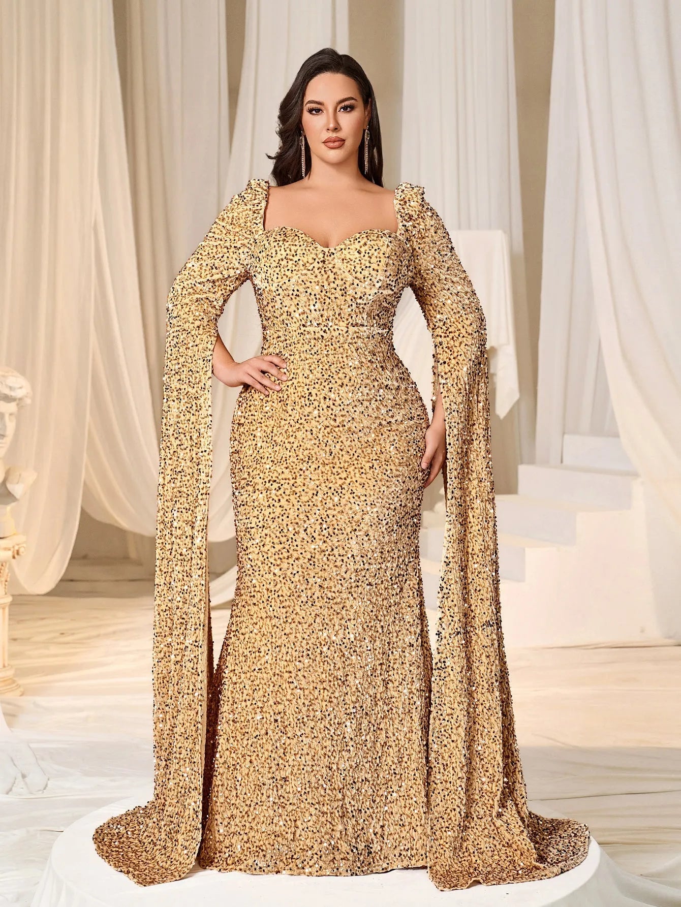 Plus Sweetheart Neck Extra-Long Sleeves Sequin Evening Dress